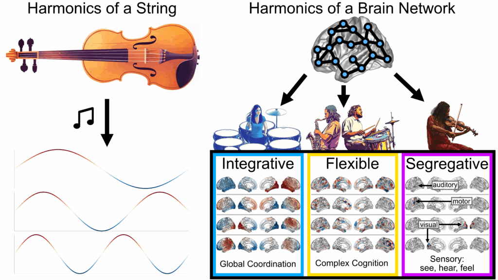 As an analogy, if the brain were an orchestra, then the structural harmonics describe different orchestral sections that join together to create the music of brain function. Here’s a my performance at a GradSlam competition using this analogy: